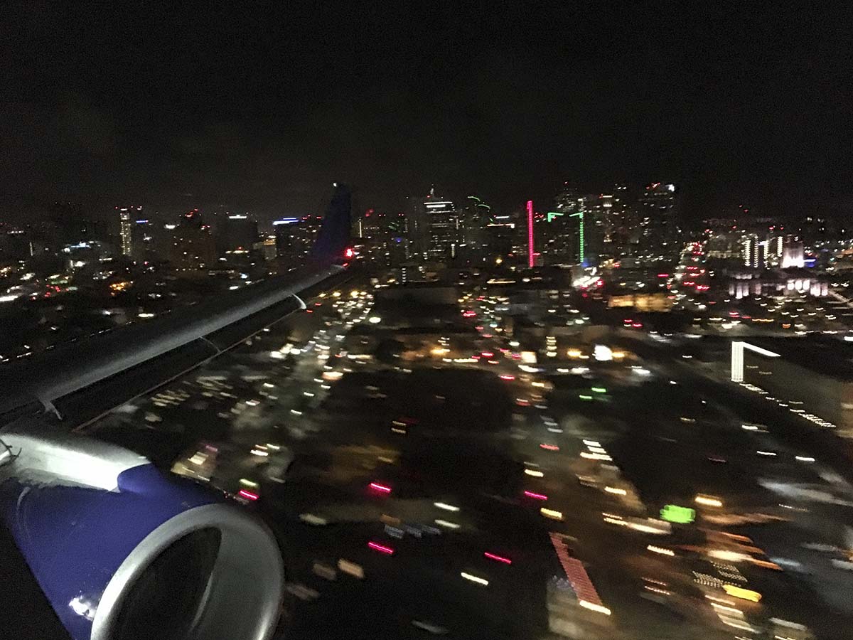 It was very dark (and rainy as heck) as we pushed off the gate at 7:36 PM. It took just 13 minutes to taxi out to the runway, and we were in the air at 7:49 PM.